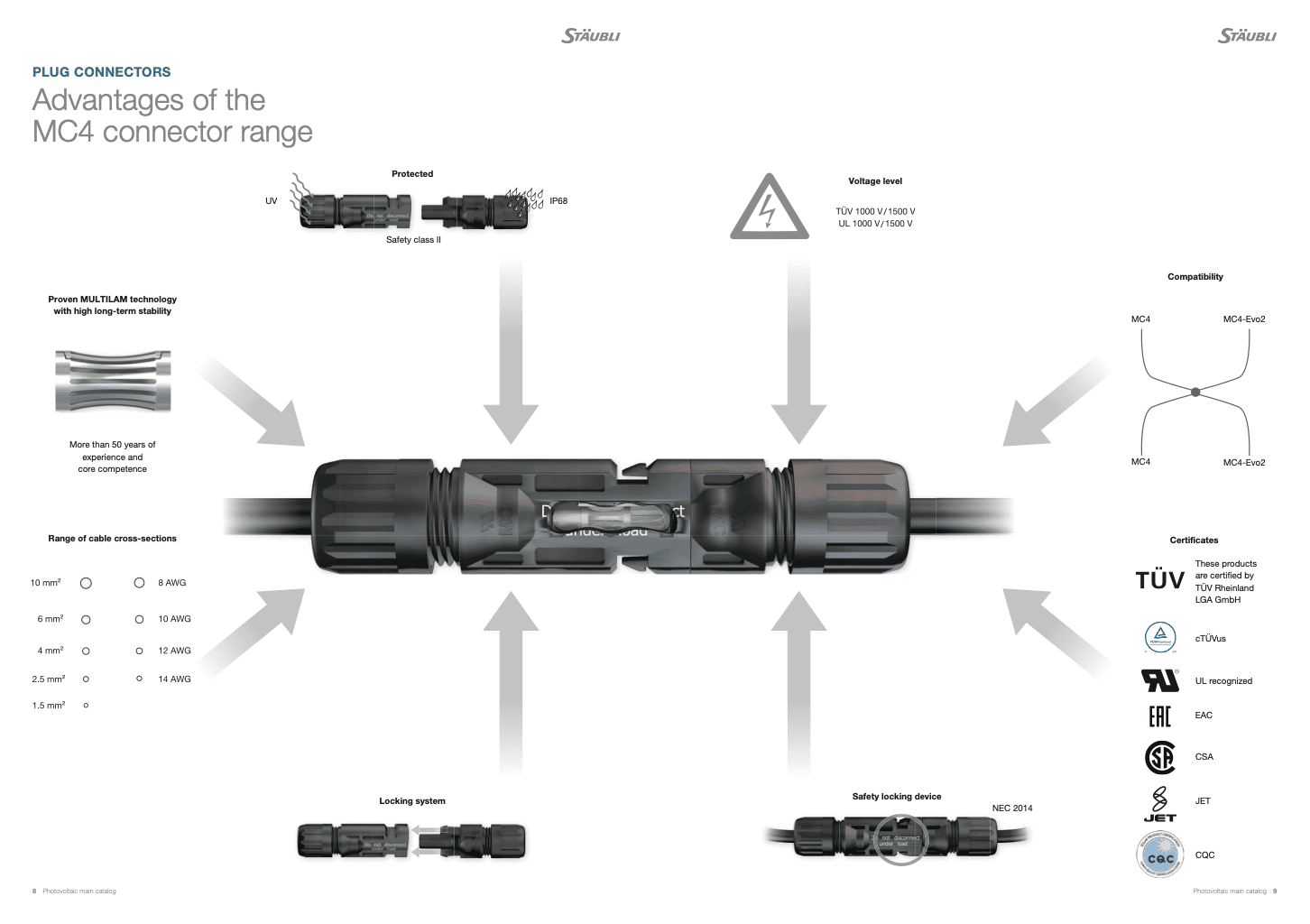 MC4連接器用於連接模組與電線,須具良好的耐候性,還須確保不會造成模組產出效能降低。Multi Contact通過TUV等多項認證,具備抗UV性,IP68防水等級,此外透過MultiLam特殊成型的連接技術,使MC4太陽能連接器具備持續性的低接觸電阻,故能有效降低太陽能系統功率損耗、減少溫度上升,避免火災,確保太陽能系統發揮高效率且安全的運行。黃金屋採用MC4連接器壽命週期及安全性更勝其他牌的瑞士原廠Staubli MC4接頭。